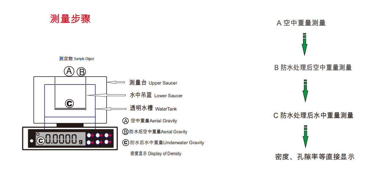 儀特諾密度儀測量三步曲,以ET-320M或ET-120HM為例,測量塊狀、片狀等不規(guī)則多孔樣品,就下面簡單的三步: